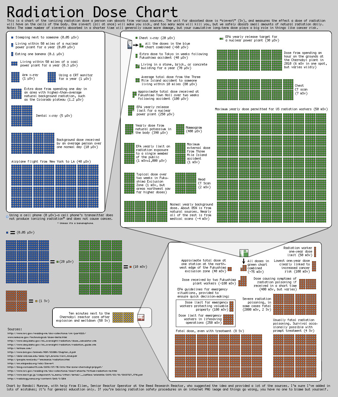 Tout ça pour dire qu’avec 1 mSv pour le public comme limite légale, on prend quand même une grosse marge. Pour les personnes soumises à une exposition professionnelle, la limite est de 6 ou de 20 mSv/an selon la catégorie de personnel.